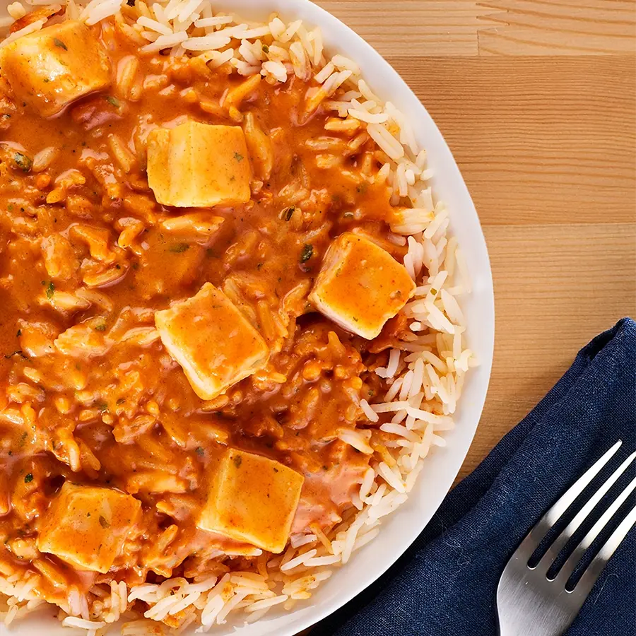 Wild-caught Alaska pollock and fragrant basmati rice are simmered in a creamy, spiced tikka masala sauce. It’s a comforting, flavor-packed dish that brings perfectly-cooked fish and a taste of India to your table in minutes.